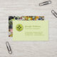 Modelo de cartão de negócios customizável para a costureira, o alfaiate, o couturier, a costureira ou as ocupações relacionadas da forma e sewing caracterizando um logotipo verde do botão na parte dianteira e uma multidão de botões coloridos na parte traseira.