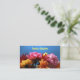 Este cartão de visita que anuncia um berçário da dália caracteriza um buquê dramático das dálias em cores brilhantes de vermelho escuro, de alaranjado, de cor-de-rosa, de amarelo e o ouro contra um céu azul puro.