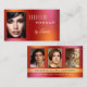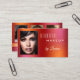 Cartão de visita com 4 fotos próprias em um portfólio em um design colorido de fundo laranja vermelho com brilhos sutis. Bonita para uma maquiadora.
