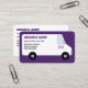 Um desenho simples de uma carrinha de entrega está na frente do cartão. Seu nome comercial, slogan da empresa, nome, título e número de telefone são impressos no painel lateral da van comercial como se fosse pintado lá. A carrinha é branca com letras roxas. A carrinha é desenhada num estilo minimalista, quase cartoon. Atrás da van está um sólido fundo roxo escuro que vai com a inscrição roxa. A parte traseira tem informações de contato adicionais. Bom para os seguintes tipos de empresas: transporte de mercadorias, entrega, transporte marítimo, logística, movimentação, transporte e qualquer outra empresa que utilize uma grande carrinha. O cartão também pode ser usado para serviços móveis como limpeza, faxina, faxineira, caminhões de comida, homem de mão, canalizadores, eletricistas, carpinteiros, pintores, instalações residenciais, serviços de saúde doméstica, HVAC, etc.