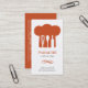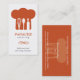 Um gráfico do chapéu de um cozinheiro laranja com ferramentas de cozinha criando espaço negativo dentro domina este cartão de visita. Versátil o suficiente para trabalhar para uma empresa de restauração, chef pessoal ou padeiro. O gráfico é repetido no reverso como uma marca d'água contra laranja sólida para compensar suas informações de contato. Disponível em cores alternativas com produtos correspondentes. com
