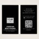 Cor preta ou personalizada, design cartão de visita moderno, profissional, vertical com campos modelo para nome, nome/cargo da empresa, logotipo (foto ou outro gráfico), código QR e informações de contato, incluindo ícones das mídias sociais. Alterar a cor de fundo, mover e redimensionar elementos com a ferramenta de personalização.