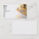 cartão de visita com uma foto de uma cozinha remodelada. Há uma pia de aço, um retro granito e armários brancos