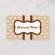 Um creme clássico e um padrão marrom decoram este cartão de visita. Personalize esta cartão de visita para atender às suas necessidades. Adicione ou apague informações, mude o estilo da fonte, tamanho da fonte, etc... O design é da arte original. Use este cartão de visita de na moda para um spa, salão, pequena empresa, decoração da casa, compro de café, chocolates gourmet, compro de sorvetes, salão de unhas, nn, cosmetólogo, pré-escola, cabeleireiro, planejador de eventos, assistência à criança, ao dia, que, padaria, etc..