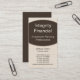 Curvas executivas profissionais cartão de visita em espresso. Este cartão de visita elegante e limpo é uma escolha excelente para alguém interessado em fazer uma primeira impressão de excelente. Uma escolha perfeita para profissionais do setor financeiro, como planejadores de investimento, analistas, gestores de empréstimos ou agentes de seguros. Para tornar este design, adicione suas informações pessoais/comerciais aos campos fornecidos. As fontes e as cores do texto podem ser alteradas clicando no botão "Personalizar!".