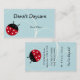 Promover qualquer negócio na indústria infantil com este design cartão de visita exclusivo com fundo azul, simples espirais brancas e adornada com uma joaninha solteiro. O texto personalizável permite que você altere fontes, altere cores e tamanhos de texto para melhor refletir sua empresa. Adequado para creches, babás, escolas, vestuário infantil e lojas de brinquedos.