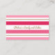 Cartão de visita de Stripes rosa, útil para muitas empresas como compres de bolo, lojas de doces e fazeres de doces. O design apresenta faixas em cores de rosa e framboesa e também linhas de cor bege. Há uma inscrição bege para a personalização na frente e também para destacar alguns detalhes personalizados no verso. Fácil de personalizar toda a redação no modelo de personalização antes de encomendar alguns destes cartões de visitas na moda.