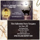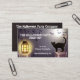 Cartão de visita apresentando um gato preto giro na noite com uma aranha em uma lanterna e morcegos pairando sobre uma lua de cheio. Na parte de trás está uma imagem de couro azul escuro. Perfeito para um negócio de fornecimento de Halloween ou outros fins relacionados ao Halloween.