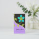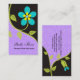 Modelo de cartão de visita de flores estilizadas e grandes turquesas, a preto. Um design elegante, impressionante, com uma flor de turquesa ousada, com folhas verdes sobre fundo preto e roxo. No roxo há uma cor damasco. Clique em Personalizar e escolha entre mais de 200 cores para alterar a cor de fundo (roxo). Excelente para florista, têxtil ou para cartão de visita pessoal.