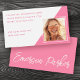 Influenciador ou blogueiro perfil cartões de visitas com seu nome na frente em uma fonte de script manuscrita de tendência. Adicione sua foto, o identificador de mídia social e o site na parte traseira e personalize o código QR. Design cor-de-rosa e branca. As cores podem ser personalizadas com a ferramenta design.