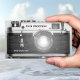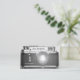 Cartão de visita com uma imagem em preto-e-branco de uma câmera com um efeito de reflexo da lente. Excelente para um fotógrafo.