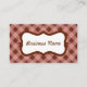 Gingham cor-de-rosa e castanho dá este estilo retrorreflector cartão de visita. Personalize este cartão de visita bonito para atender às suas necessidades. Adicione ou apague informações, mude o estilo da fonte, tamanho da fonte, etc... O design é da arte original. Use este cartão de visita de na moda para um salão, pequena empresa, decoração doméstica, comida gourmet, chocolates, compro de sorvetes, salão de unhas, dentro, design de interiores, designer de bolo, cuidado infantil, compra de presente, cama e café da manhã, boutique, padaria, comprada, restaurante, etc..