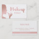 Trendy, cartões de visitas contemporâneos excelente para artistas de maquiagem freelance! O design apresenta a linda silhueta de uma dama enquanto uma mão está aplicando batom. Um olhar luxuoso com a textura falsa de ouro rosa. A tipografia do pincel diz "Makeup". Personalize facilmente com seus detalhes comerciais.