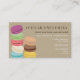 cartão de visita de uma padaria ou de um pasteleiro com uma ilustração de oito macarões franceses à esquerda. Personalize o texto com suas informações.