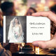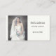 Um cartão de visita simples, porém chic, para um planejador de casamento, com uma foto de uma noiva sobre um fundo branco.