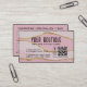 Este cartão de visita tem uma agitação cor-de-rosa e dourada com seus detalhes na tipografia sans-serif, e apresenta um sistema clássico de recompensa no verso para os clientes retornarem e receberem algo, isto é, desconto, item livre, etc. Preencha os detalhes com o nome da sua empresa, serviço comercial, número de telefone, site, endereço, identificador social, URL de código qr, horas de armazenamento ou mensagem e informações de recompensa no verso.