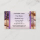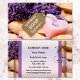 Um cartão de visita com bar de sabão em forma de coração e flores de lavanda com uma etiqueta opcional na frente. Bonito para quem vende sabão feito à mão ou terno, massagista ou compro de presentes.