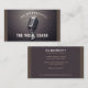 O Cartão de visita do Treinador Vocal tem um design elegante em estilo minimalista com apenas um destaque do microfone com uma coroa sobre fundo de madeira escuro, uma faixa vertical marrom complementar em ambos os lados e uma tipografia branca em contraste com o fundo. É bastante vintage como no estilo do microfone com uma reviravolta moderna.