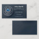 Uma bússola matemática prateada e divisor em um escudo azul sobre um fundo azul escuro faz um cartão de visita afiado e profissional para um construtor, empreiteiro, arquiteto ou engenheiro.