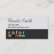 Um bar de caixa de cores com a palavra cor sobre ela é a imagem base para este design. A metade inferior é uma cor de cinza com uma textura aplicada e a parte superior é branca com uma textura de aparência de tecido aplicada. Esta é uma cartão de visita de aparência muito divertida, moderna e profissional que pode funcionar para muitas profissões, mas especialmente para designers de interiores.
