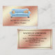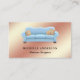 Cartão de visita elegante com um belo sofá azul em um fundo de folha de rosa de ouro falso. Adicione seu nome e detalhes de contato para fazer uma primeira impressão duradoura.