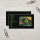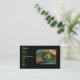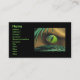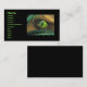 Cartão de visita com a minha imagem de um olho raptor verde com reflexões de palmeiras, brilhando através de galhos de palma.
