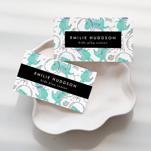 Cartões de visitas bonitas, divertidas e adoráveis com dinossauros espaciais. Design moderno e moderno, perfeito para crianças que brincam com centros de brincadeira, parques de brincadeiras, centros de atividades, assistência à criança, assistência ao dia, babás e babás.