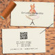 Um formulário de preparador está centrado na frente deste design de modelo de cartão de negócios com nome e título na frente. Os detalhes de negócios estão atrás. Preencha os campos de modelo ou clique em personalizar para selecionar um estilo de fonte, tamanho e cor desejados.O marcador de posição de código QR está no verso. Substitua o código QR pelo seu. Enviar clientes para seu site, fotos, referências ou outra página com o link de código QR
