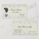 Cartão de visita elegante do olhar do vintage, feito em um olhar de linho da cor do pergaminho, com design barroco bonito, na parte superior e na parte inferior. Um desenho do vintage de um penteado elegante das senhoras é pintado colorida dentro e decora o canto dianteiro inferior do cartão. Personalize o texto para serir suas necessidades. Cartão de visita bonito para beauticians, salões de beleza, e lojas do vintage.