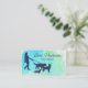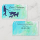 Cartão de visita de temática "Dog walker" feita em fundo azul e verde de aquarela, com gráficos de silhueta azul escuro de um andador de cães com três cães. Todo texto é totalmente personalizável. Personalize este cartão divertido para a sua empresa.