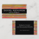 Design de cartão de visita com abstrato, moderno e moderno, colorido, com padrão de stripes arco-íris. Fácil de personalizar com seu nome, informações de contato e detalhes da empresa. Legal e divertido, mas elegante, perfeito para o design de interiores, planejador de eventos, planejador de festas, decorador, maquiador, designer de móveis ou estilista. Você também pode clicar no botão Personalizar para alterar fontes e cores ou adicionar seu logotipo ou outras imagens. Produtos de marca correspondentes: com