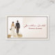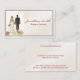 Um cartão de visita com um planejador de casamento em mente. Mostra uma noiva e um noivo com as mãos a caminhar à distância. Um design simples e limpo com borda fina e preta.