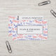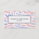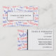 Um design moderno com frases de principiante francês em vermelho e azul sobre fundo branco. No meio, há uma caixa branca com um esboço preto para seu nome e profissão, ou um nome comercial e slogan. Isso seria perfeito para um professor de língua francesa ou um professor particular. No verso, o design é repetido com mais espaço para seus detalhes.