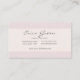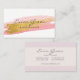 Cartão de visita de fundo branco simples com cor d'água de traçado manual, cor rosa e ouro, com letra elegante manuscrita. O verso contém informações pessoais em fontes elegantes e decorativas com fundo vermelho em retângulo transparente.