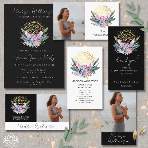 Dourado Cartão com fotos Espiritual de Spa Spa Psíquica de Cristais Rosa de Mandala com fundo negro. Design de aquarela mágica com mandala de ouro, cristais cor-de-rosa, penas, buquê de flor botânica com folhas e penas verdes. Perfeito para o seu negócio metafísico, esotérico, spa, terapeuta, curador de energia, tarô clínico e espiritual e psíquico. Texto pronto para suas informações. *Substitua a foto pela sua.