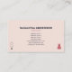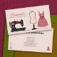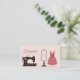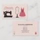 Um cartão de visita de costureira com ilustração de uma máquina de costura, um manequim de costura e um vestido com pinos de costura sobre um fundo de rosa claro. Perfeito para atividades como costureira, alterações, reparações, desenhador de moda, alfaiate, costura feita à mão, etc.