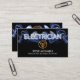 Um relâmpago luminoso azul-relâmpago zapeia pela face da placa. Andar pela onda elétrica é um sinal de "eletricista" com um logotipo de lâmpada de ouro logo abaixo. Seguem-se o seu nome prestigiado e os contatos.