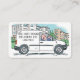 Empresa de entrega de Comidas quentes para pequenas empresas com nome em uma Van de empresa. Ilustração colorida de um condutor à roda de uma carrinha branca. A ilustração aparece em ambos os lados do cartão de visita. Perfeito para um negócio de Serviços de Entrega de Comidas de Compras ou para um homem de entrega e cartão de chamada de carrinha.