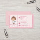 Cartão de visita para enfermeiro ou assistente. À esquerda está uma fotografia de uma enfermeira de desenho animado com um conselho de clipe. abaixo da enfermeira estão modelos em letras cor-de-rosa para o seu nome e cargo. À direita estão modelos para seus detalhes comerciais. A parte traseira, se a placa estiver cor-de-rosa com pontos de tinta.