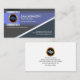 Uma cobrir cinza escura com faixas na moda re-bar sentada no canto superior esquerdo. Ele tem uma coluna azul subjacente que contém o logotipo dourado de uma silhueta da cidade com seu nome prestigiado e cargo ao seu lado. O nome da empresa fica logo abaixo com uma opção de slogan correspondente embaixo do logotipo. Um triângulo azul escuro com uma camada branca subjacente no canto inferior direito armazena os detalhes do contato.