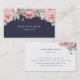 Cartões de visitas elegantes e quic apresentam uma cobertura de flores cor-de-água cor-de-rosa florescendo do topo, sobre um fundo azul marinho da meia-noite profundo. Personalize com seu nome e nome comercial, título ou profissão. Adicione seus detalhes de contato de cheio ao fundo em uma mistura chic de sans serif e itálico modernos, enfeitados com peonias menores no canto superior direito. Uma escolha entre chic e feminina em uma mancha de tendências e marinho para maquiadores, cabeleireiros, esteticistas ou qualquer ocupação.