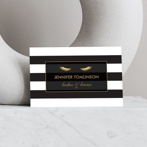 Coordena-se com os Eyelashes do Ouro com o Modelo de cartão de negócios Black and White Stripes até 1201AM. Um fundo preto e branco riscado em negrito cria interesse visual sobre esta placa de serviço de pós-tratamento de extensões de lash personalizável. © 1201AM CREATIVE