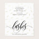 Cartão de visita dobrado para um artista de barra com informações de contato e instruções de pós-tratamento de extensão de pestana para seus clientes. Um padrão de lascas de ouro falsas espalhadas pelo cobrir e atrás. Um belo roteiro de caligrafia.