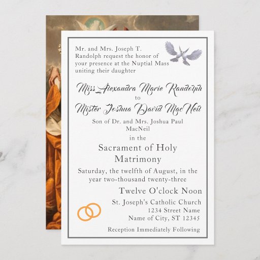 Design de Foto de Casamento em Massa Latino apresenta uma bela imagem da famosa pintura do casamento de Mary e Joseph em cobrir externo. À direita está o seu texto. Dentro mostra sua mensagem pessoal de gratidão no topo, logo acima da assinatura do casal. A imagem dos anéis de casamento juntos aparece abaixo. A foto que você fornece é exibida na parte inferior do painel interno. O reverso contém um verso Bíblia adorável, juntamente com a frase latina, "Semper Fidelis" e sua tradução, "Sempre Faitista" Ideal para favores em um casamento em Massa Latina, ou qualquer casamento. Muito bonita.