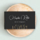 Chic e limpe com nome simples frente com letra branca de script com flores silvestres douradas em fundo preto.