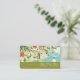 Flores vermelhas, folhas e espirais em cartões de visitas de fundo verde-oliva e azul-turquesa. Há uma banda verde-oliva no fundo com o seu nome.