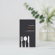 Ilustração gráfica do garfo, colher e faca correm da borda deste cartão de visita único. Perfeito para restaurantes, chefs pessoais ou amantes de comidas. © 1201AM DESIGNS