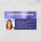 Apresente-se melhor aos seus clientes. Um ícone azul roxo escuro, simples, moderno, e uma tipografia branca e ousada sobre uma banda azul roxa escura sobre um cinzeiro macio, azul roxo esfregado e falso sobre fundo azul roxo na frente desta cartão de visita gráfica elegante e elegante. Sua foto personalizada está atrás. Personalize com seu nome de cheio e negócios na frente. Preencha o verso com a foto de sua escolha, números de telefone, endereço, email, site e contas de mídia social. Faz uma declaração chic, profissional e na moda onde quer que você vá. Também estão disponíveis nesta coleção outras fontes de patrimônio de coordenação, como pastas, pranchetas, planejadores e muito mais. Basta adicionar sua foto e digitar seu nome, nome comercial e todas as suas informações adicionais na seção "Personalizar esta Modelo" e você pode personalizar facilmente esta cartão de visita de fotos. Por favor, me mande mensagens com quaisquer perguntas ou solicitações.