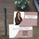 O design apresenta uma brilho rosado sujo no fundo desse design com um espaço reservado para fotos à esquerda com o nome do modelo e o título à direita. O verso inclui um design coordenado e cores com campos de texto para o nome e os detalhes da empresa. Substitua a foto do espaço reservado pela sua fotografia no formato vertical. Preencha os campos modelo ou edite usando a ferramenta design para selecionar um estilo de fonte, tamanho e cor desejados. A foto do marcador de posição é cortesia em pixabay.com.