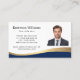 Cartões de visitas de borda curvos modernos, azuis escuros e ouros (gradiente de cor impresso, não folha real) com sua foto personalizada, seu nome, título e informações de contato. Você pode alterar as cores de fundo e fonte, mover e redimensionar elementos com a ferramenta design. Carregue seu logotipo no verso.